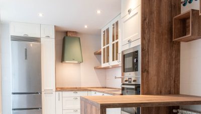 Muebles de cocina en madera roble de verano y blanco polar. La calidez de la madera y la superficie tipo mármol, conforman un acogedor conjunto que se complementa con el blanco polar en mate. Esta combinación de materiales crea un cálido ambiente que invita a disfrutar del placer de cocinar. La distribución se ha estudiado