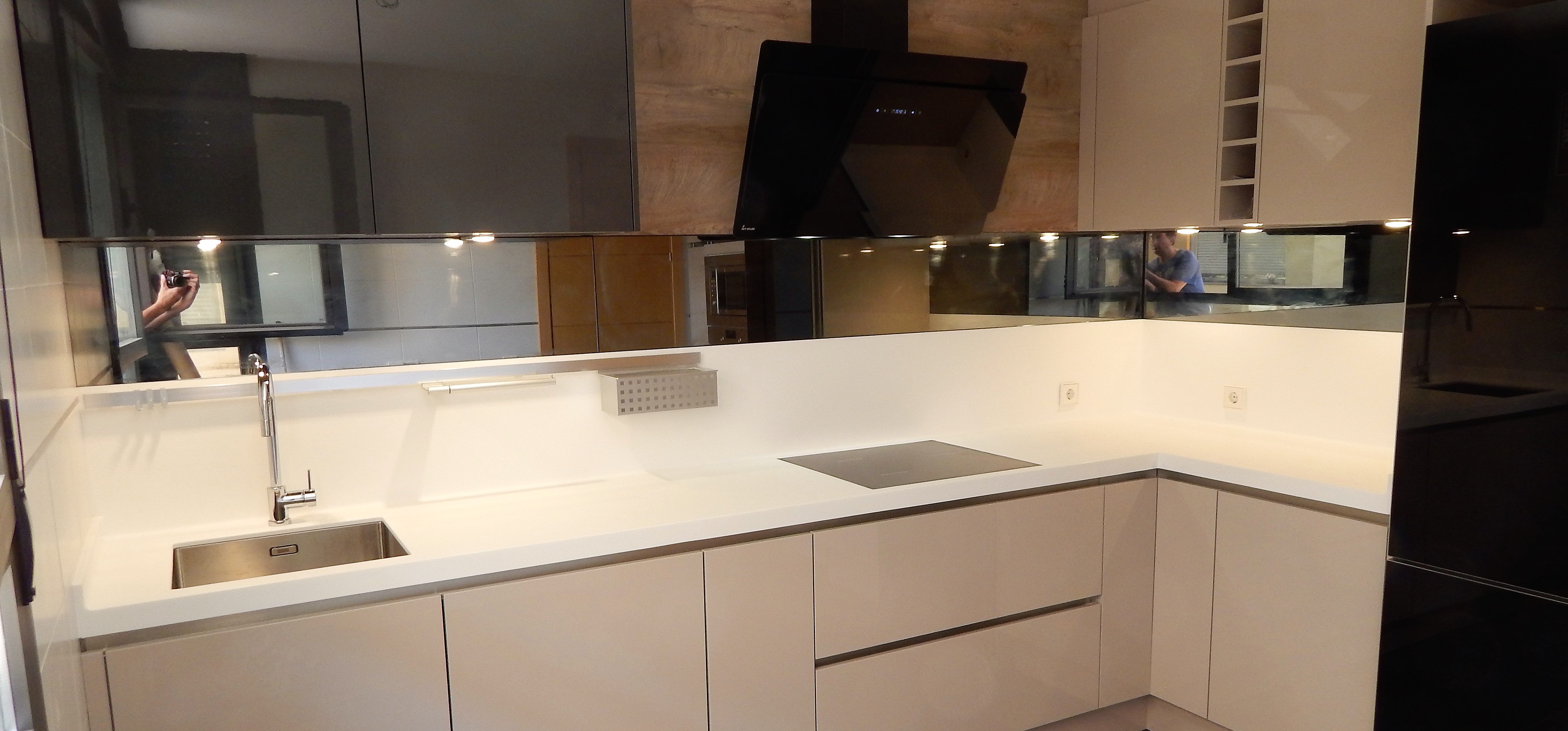 Cachemir, madera de roble y grafito son los colores que combinan en esta instalación diseñada con nuestro modelo laser en brillo. Diseño sin tirador, con gola de acero y una encimera acrílica en blanco con el frontis de media altura del mismo material y la segunda sección en espejo de color gris oscuro.