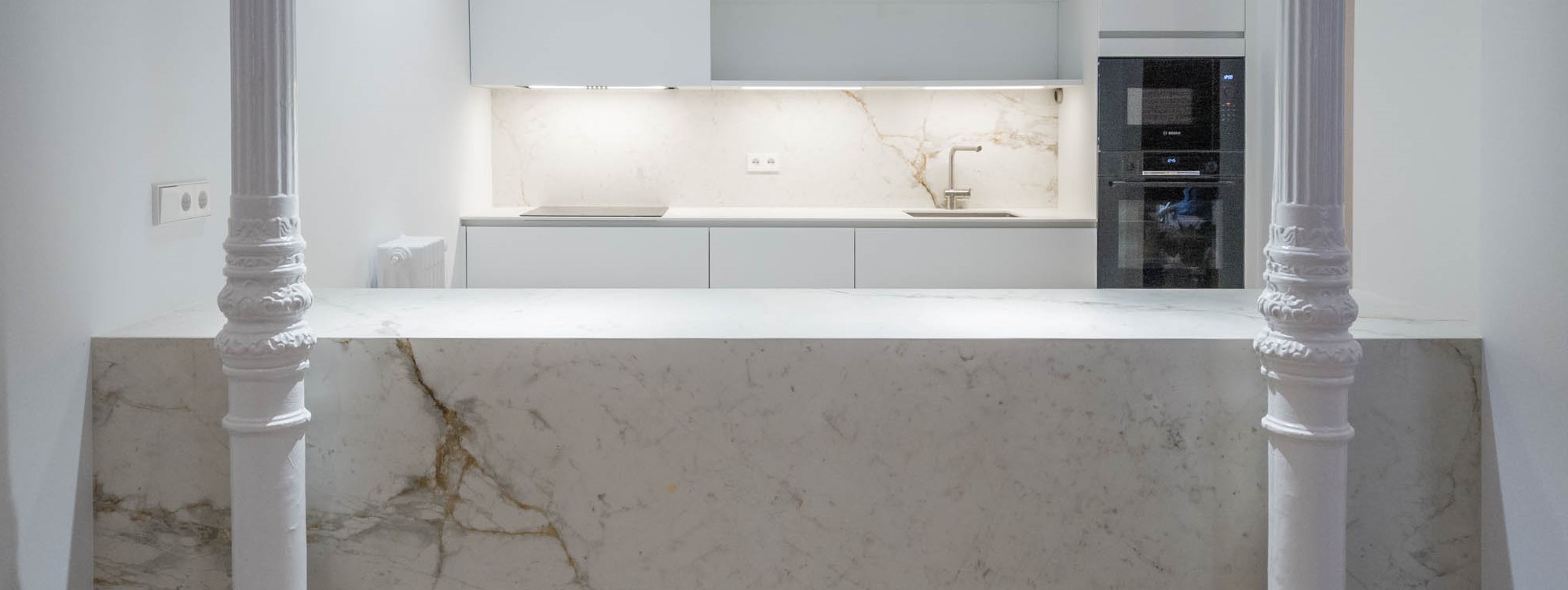 Carolina ha elegido nuestro modelo 2135 en blanco cristalino y acabado mate antihuellas para su nueva cocina. Lo ha combinado con una encimera porcelánica imitación mármol veteado. El frente de pared es del mismo material, de esta manera se evita la necesidad de alicatar la cocina y el resultado es muy acogedor para esta cocina de diseño abierto al salón.