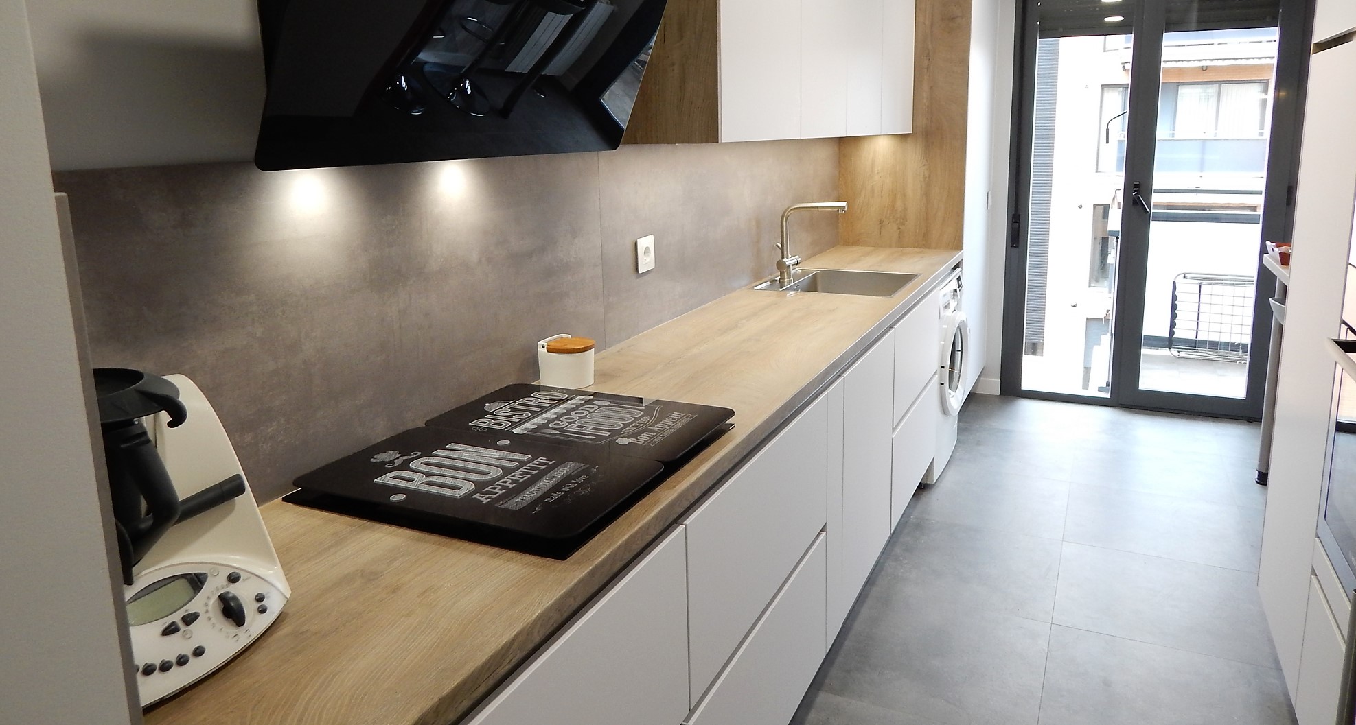 Inma y Javier han elegido el modelo laser en color blanco polar para la reforma de su cocina, lo han combinado con una encimera de duropal en color roble natural y han optado por el diseño sin tiradores, con gola de acero. En esta reforma se ha evitado el alicatado, para proteger la zona más expuesta se ha cubierto con un panel estratificado imitación hormigón gris, esta práctica opción combina a la perfección con el material del suelo y facilita las labores diarias por su fácil limpieza.