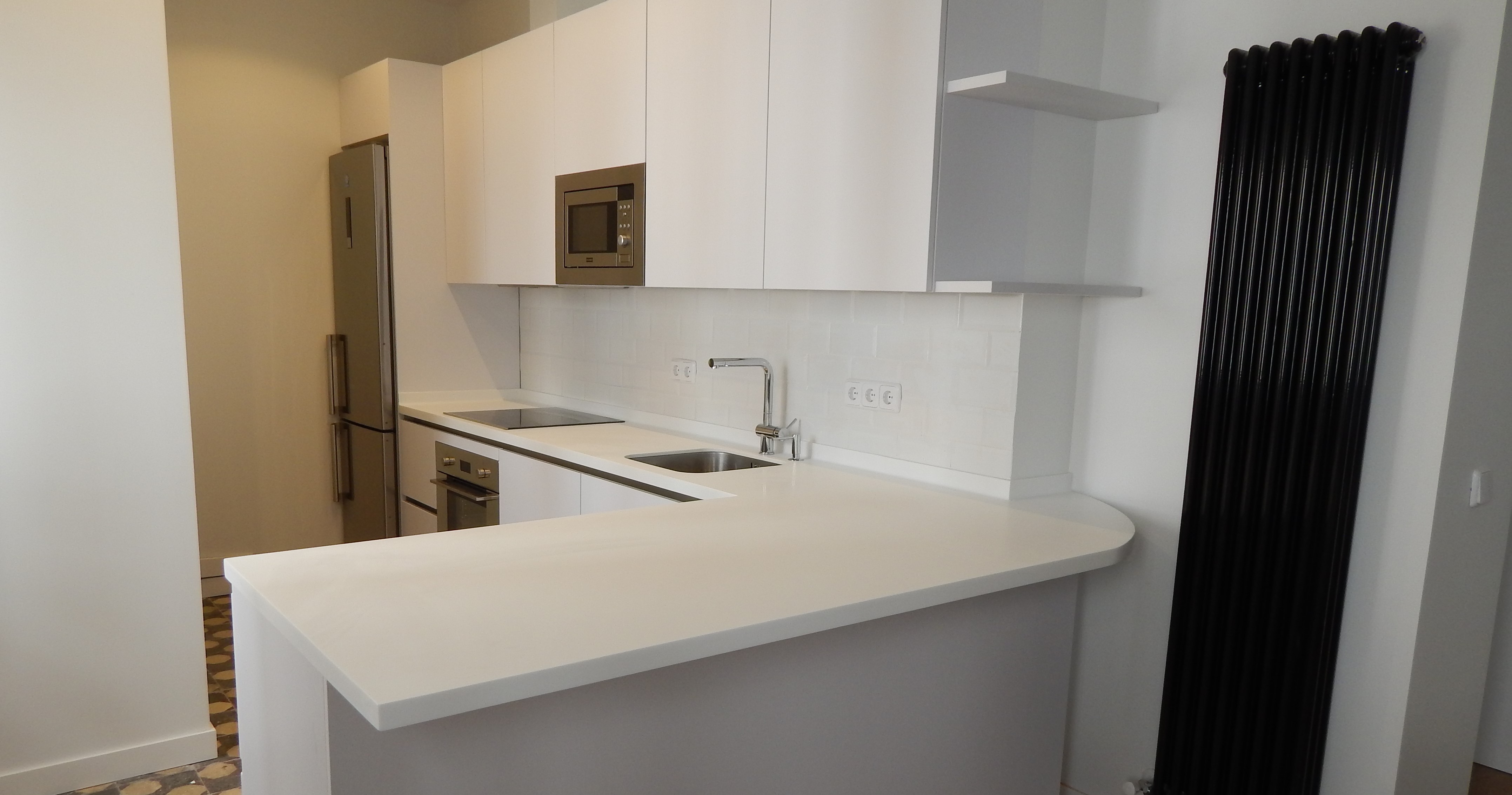 El resultado es una cocina totalmente integrada en el salón pero con una clara separación de ambientes que se consigue con el color blanco del conjunto y la práctica barra.