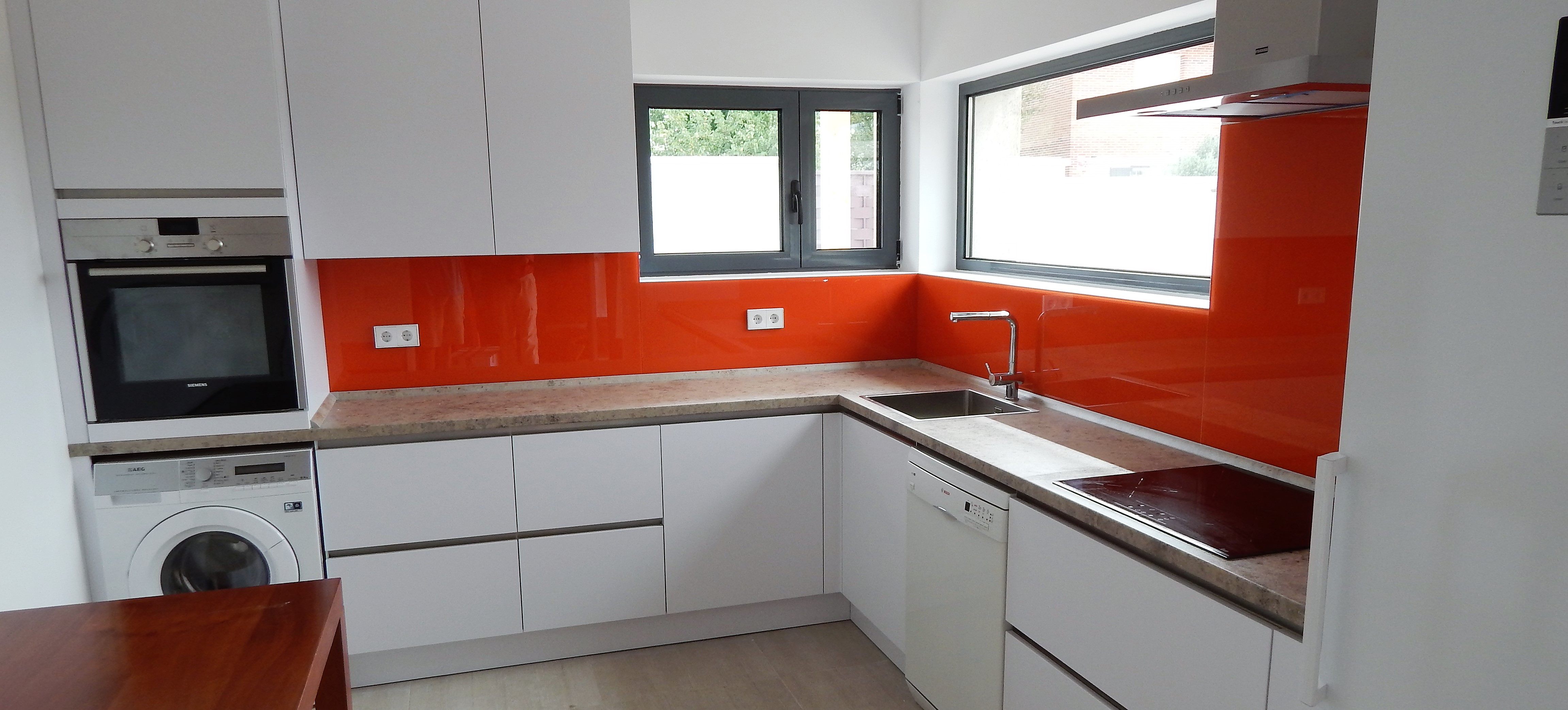 Estamos encantados con nuestra cocina, funcional y a la vez atrevida por el color naranja que contrasta con el blanco polar y le da un toque diferente y alegre.