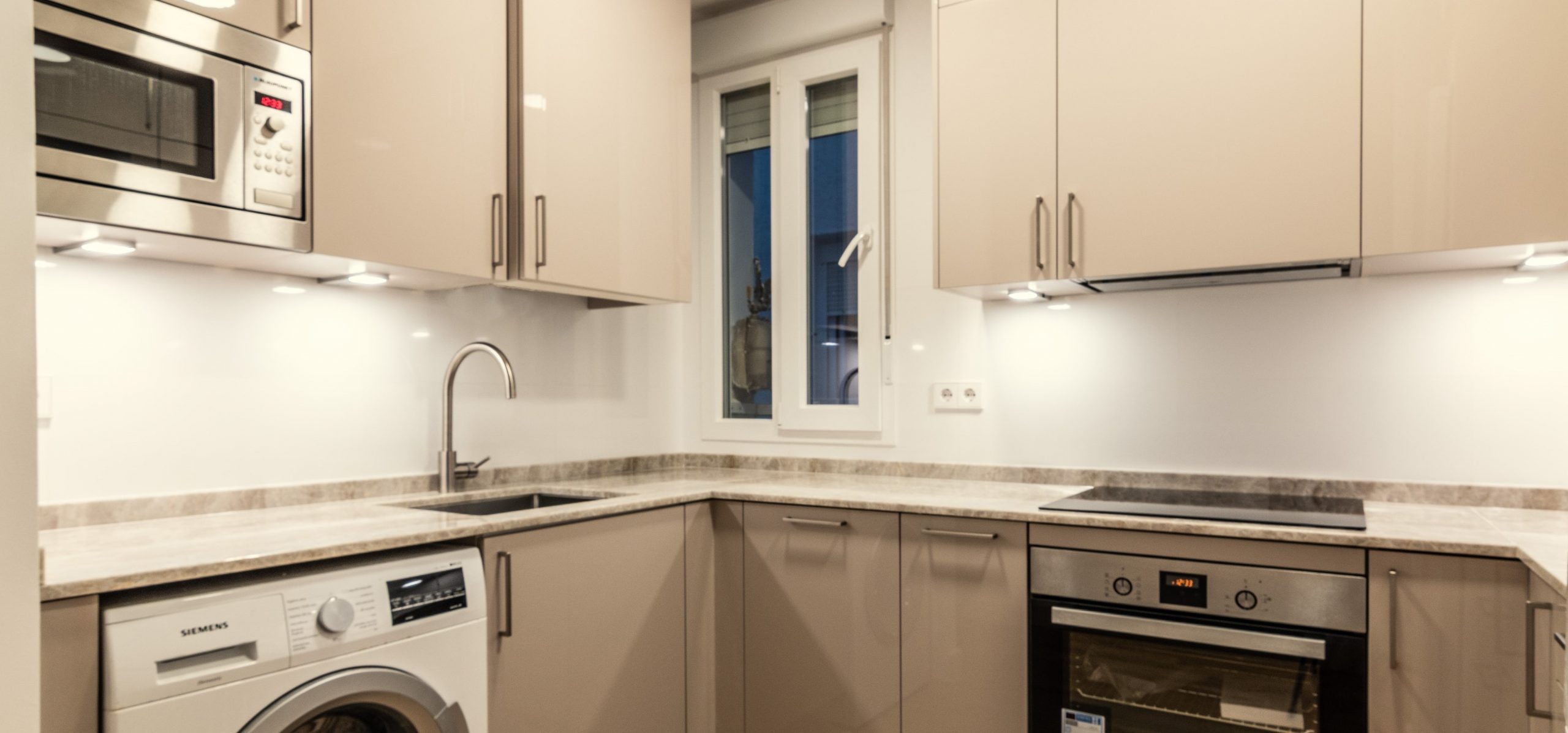 Cachemir y granito perla venata son los materiales elegidos en esta instalación diseñada con nuestro modelo laser en alto brillo. Una acertada y luminosa combinación en este cocina de concepto abierto.
