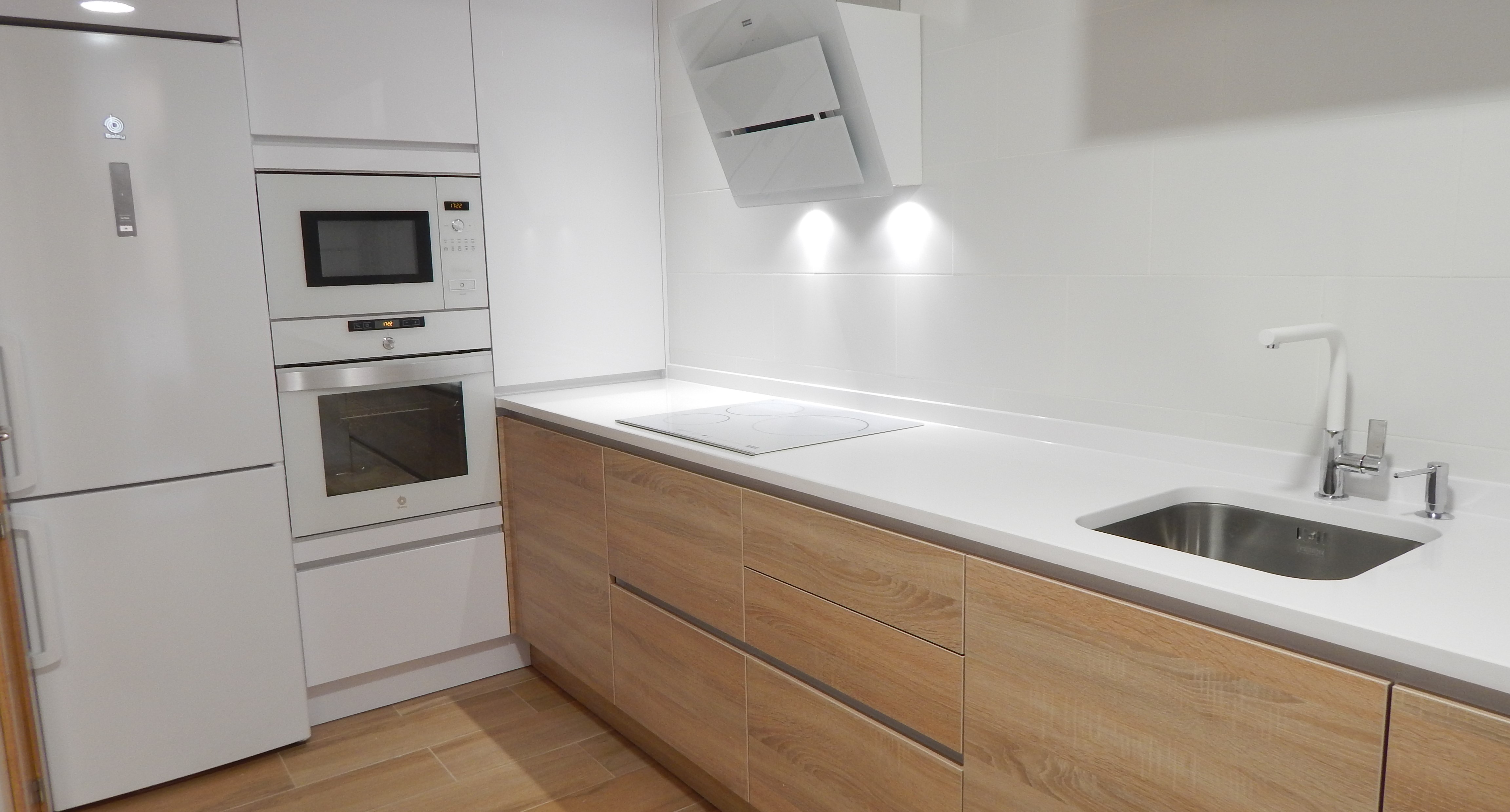 La calidez de la madera se combinan con el blanco polar en alto brillo. Nuestro modelo Atlanta en color roble agreste y el modelo Lasser en blanco polar, planificados con gola lacada en blanco, sin tiradores, y una amplia encimera de silestone, conforman este atractivo conjunto.