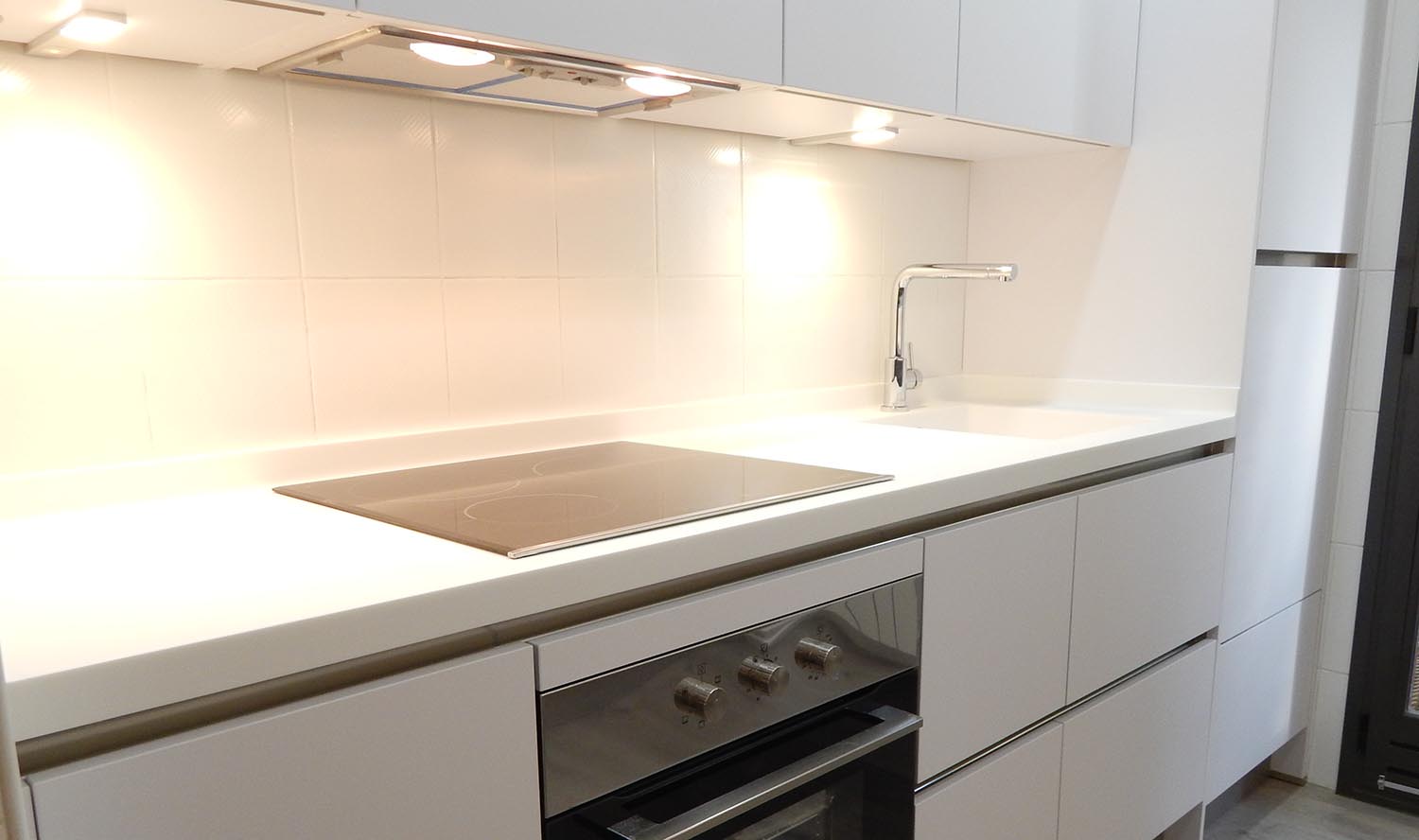 Destaca la acertada elección de la encimera. El material acrílico es el único material que permite uniones sin juntas visibles dando la sensación de ser de una sola pieza, incluso el copete de remate a pared se integra con una suave curva también sin juntas visibles, evitando, de esta forma, incómodos rincones donde se suele acumular la suciedad y que se resuelve, con cualquier otro material, con juntas a base de siliconas,