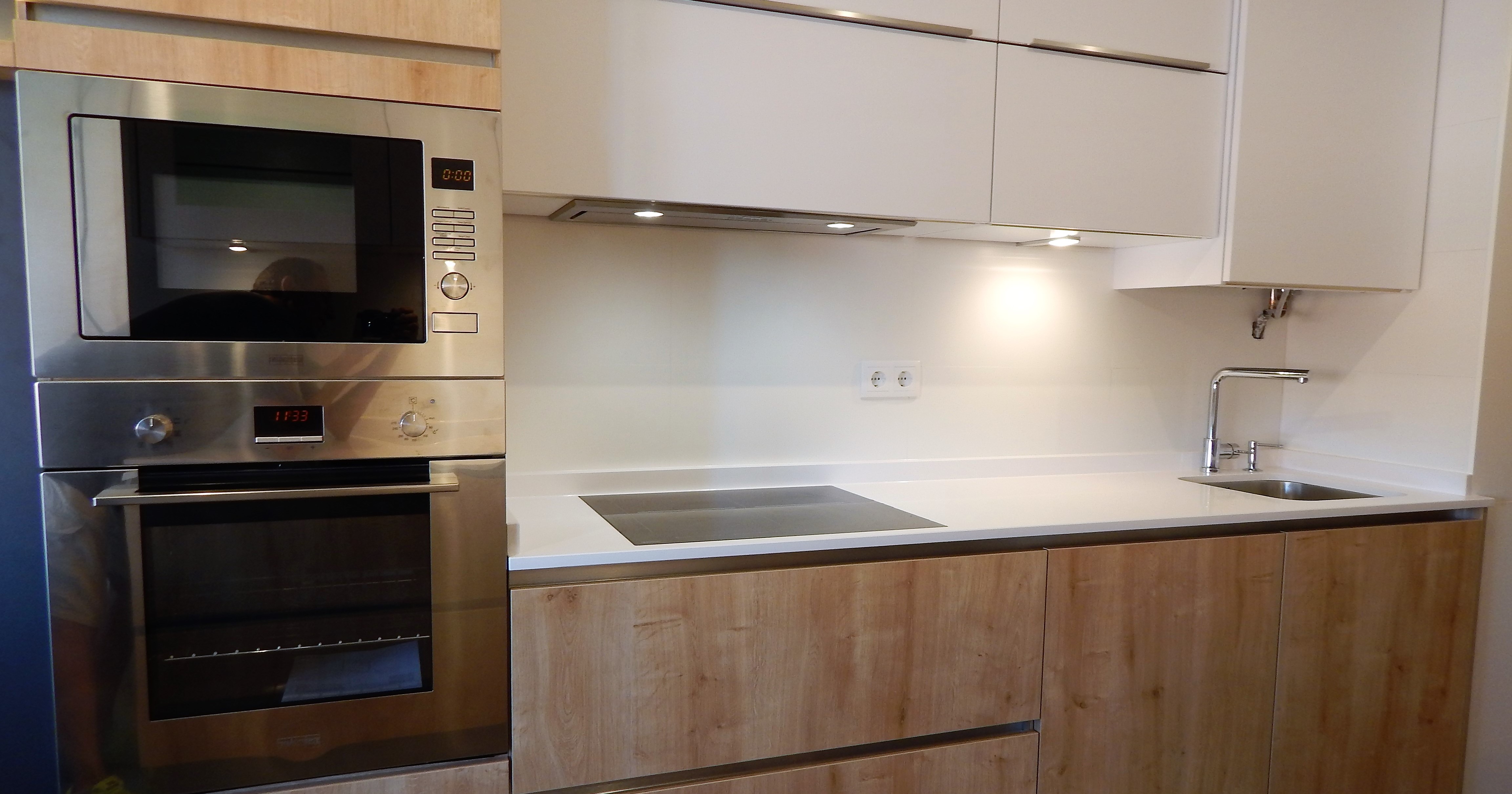 Muebles de cocina en blanco polar mate y madera de roble cornwall, la integración de los electrodomésticos y una acertada combinación que encaja a la perfección con todos los materiales de obra utilizados, son las claves de esta nueva instalación.