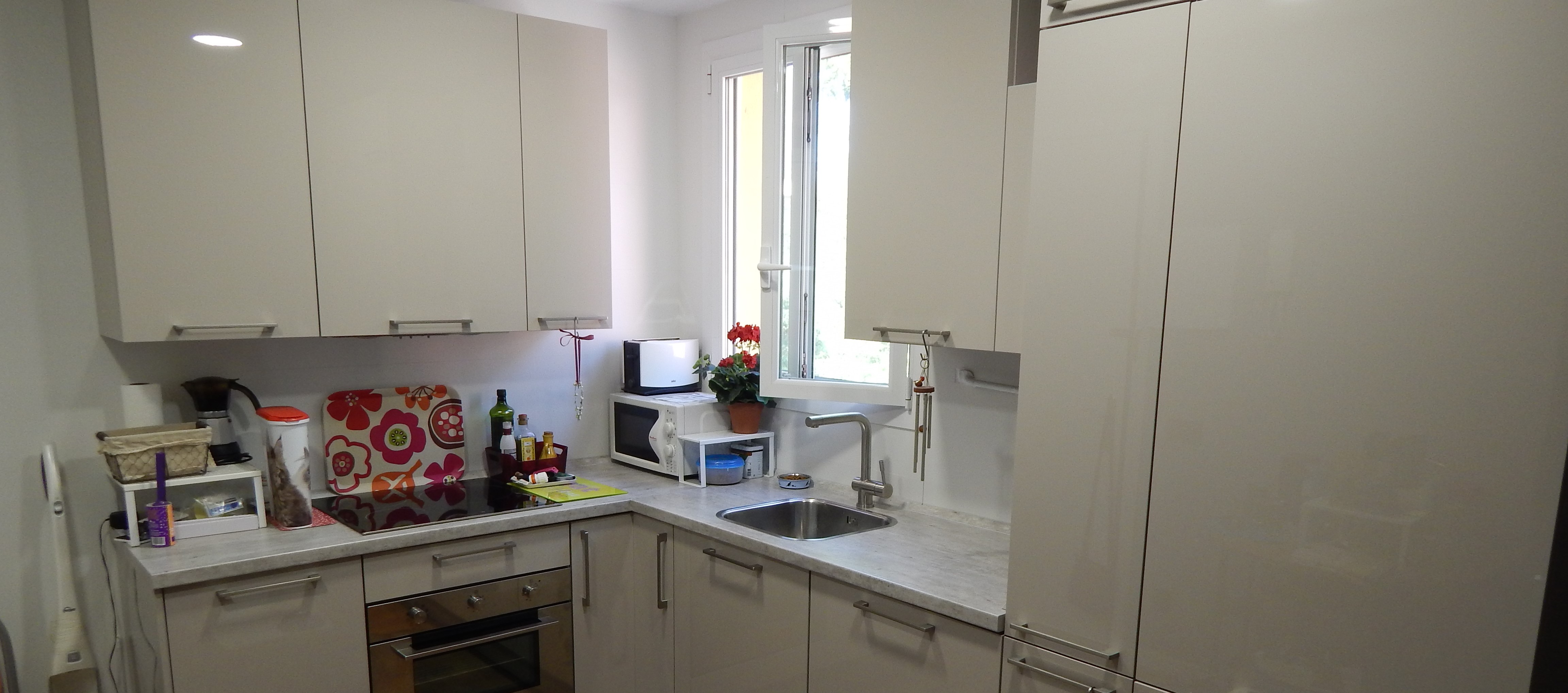 Maria eligió nuestro modelo lasser por su acabado alto brillo y su fácil mantenimiento, se trata de un laminado muy resistente al uso diario y con un acabado impecable.  Para la encimera eligió nuestras encimeras estratificadas de duropal, en concreto el modelo hormigón natural. Estas encimeras resisten el trato más duro y ofrece grandes posibilidades de diseño.