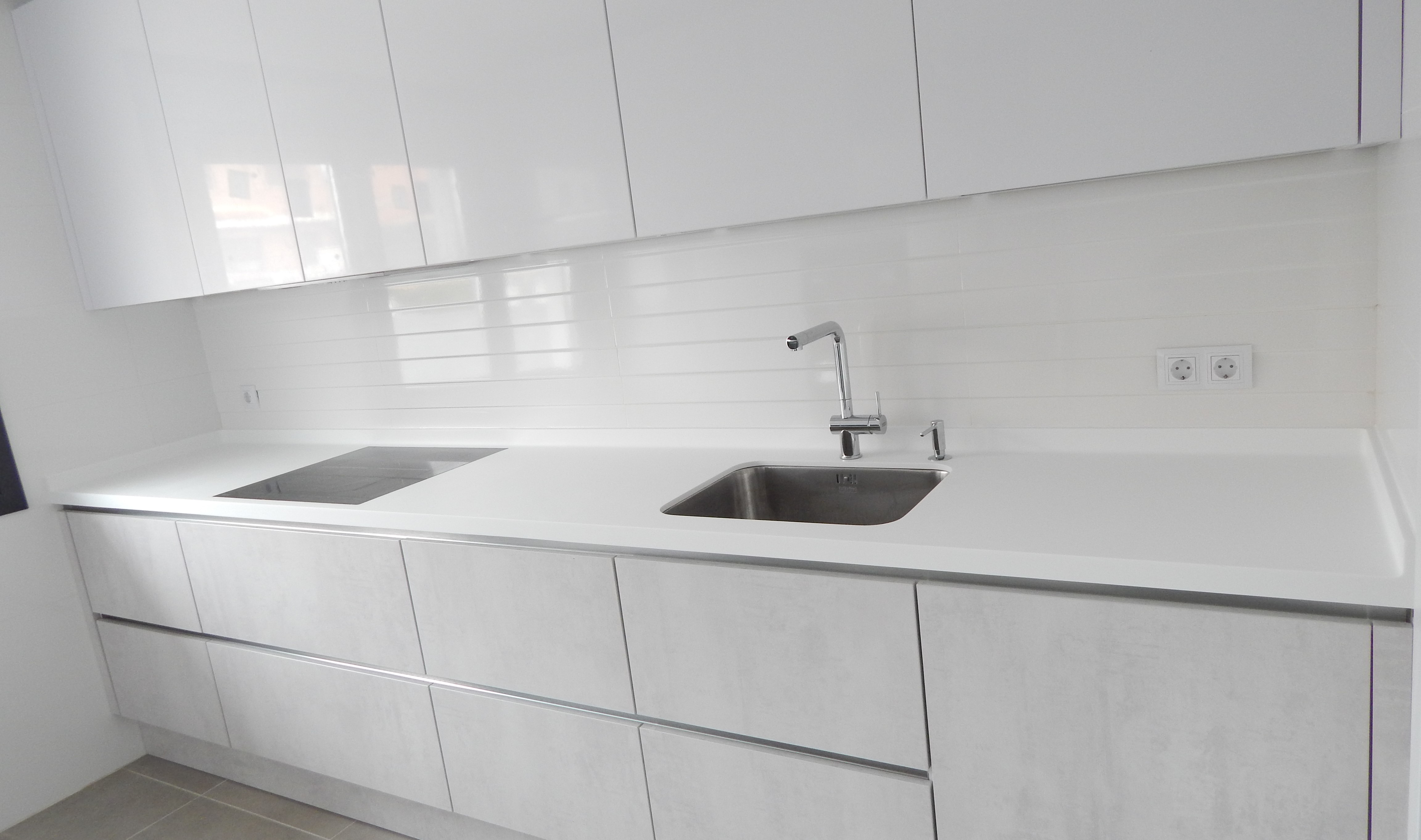 En el diseño destaca la encimera acrílica (solid surface) es una magnífica elección. La principal característica de este material es su ausencia aparente de juntas y de rincones, también es totalmente higiénico y fácil de mantener por su nula porosidad. Destaca en este montaje la placa de inducción enrasada con la superficie de la encimera, de esta forma quedan protegidos los bordes de cristal y se facilita la limpieza diaria.