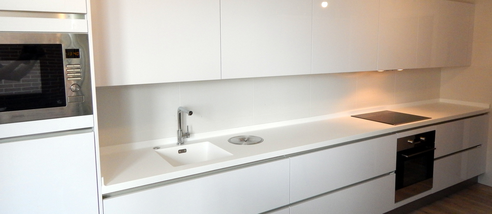 El blanco es el protagonista de este nuevo montaje. En esta ocasión hemos combinado nuestros muebles de cocina modelo Lasser, en color blanco polar de brillo intenso, con nuestras encimeras acrílicas (solid surface) en color pure white. El diseño lineal, la ausencia de tiradores, la gola de acero, y los muebles bajos con frentes de gran tamaño, crean un espacio con una gran luminosidad y amplitud.