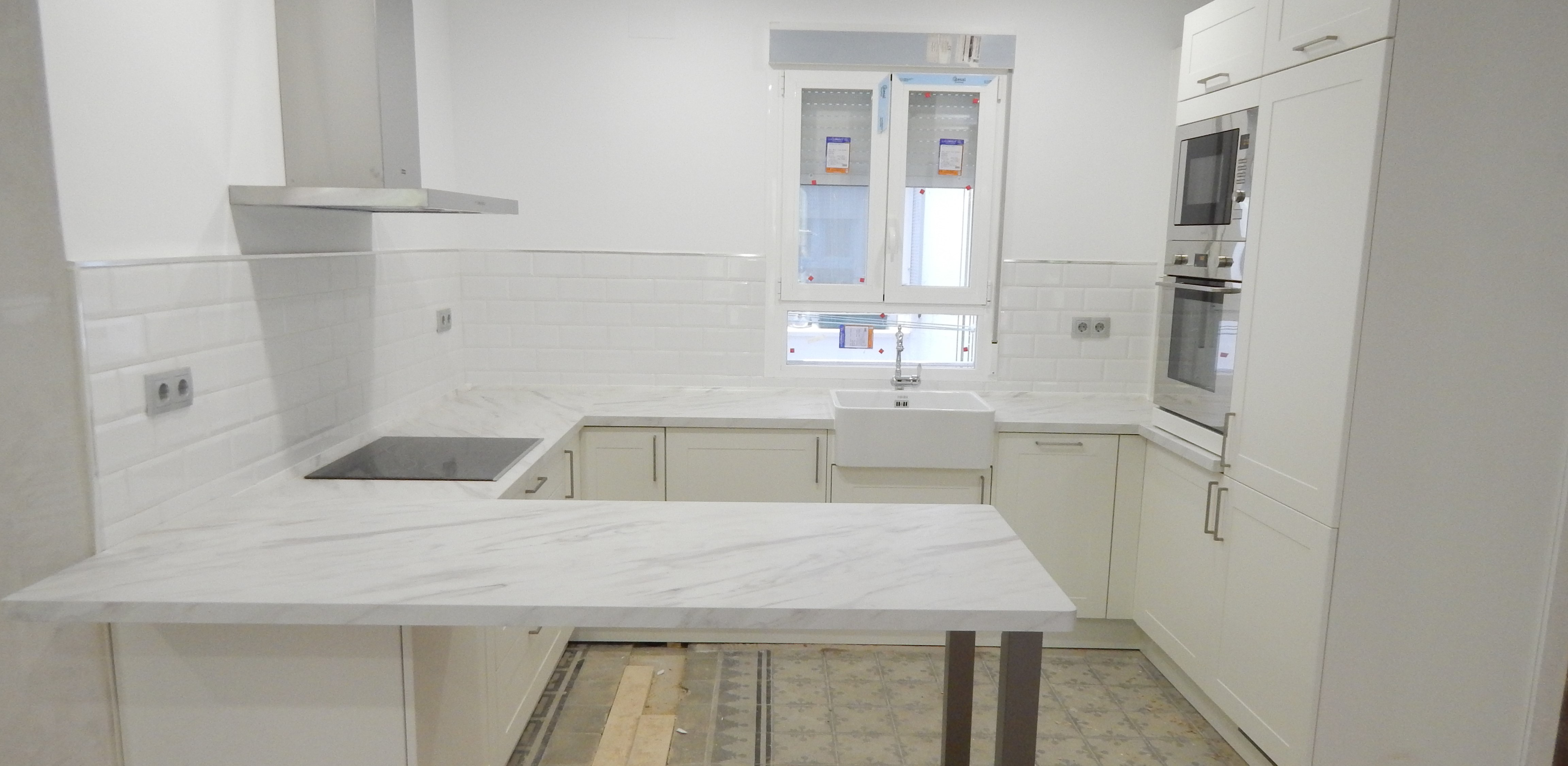 Isabel ha elegido nuestro modelo lotus para la reforma de su nueva cocina. Es un material polilaminado de muy fácil limpieza y mantenimiento. El color blanco de los frentes se combina con una encimera de duropal imitando a mármol. El suelo de original, recuperado en este antiguo edificio del centro de Madrid, y las paredes en color claro crean un ambiente muy acogedor que invita a disfrutar del amplio espacio.
