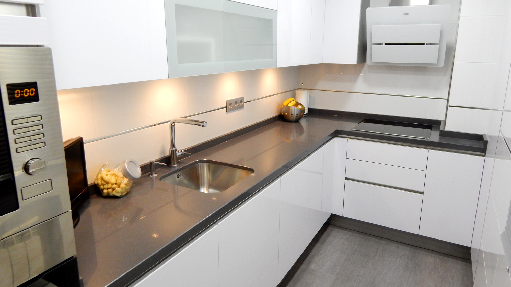 El diseño sin tirador, el aprovechamiento de cada espacio y la optimización de la distribución juegan un carácter vital en este montaje. Nuestro modelo Lasser en blanco polar en acabado alto brillo, combinado con encimera color gris plomo fue el elegido en esta ocasión. Es un modelo con un acabado impecable, alta resistencia al uso diario y de muy fácil mantenimiento.