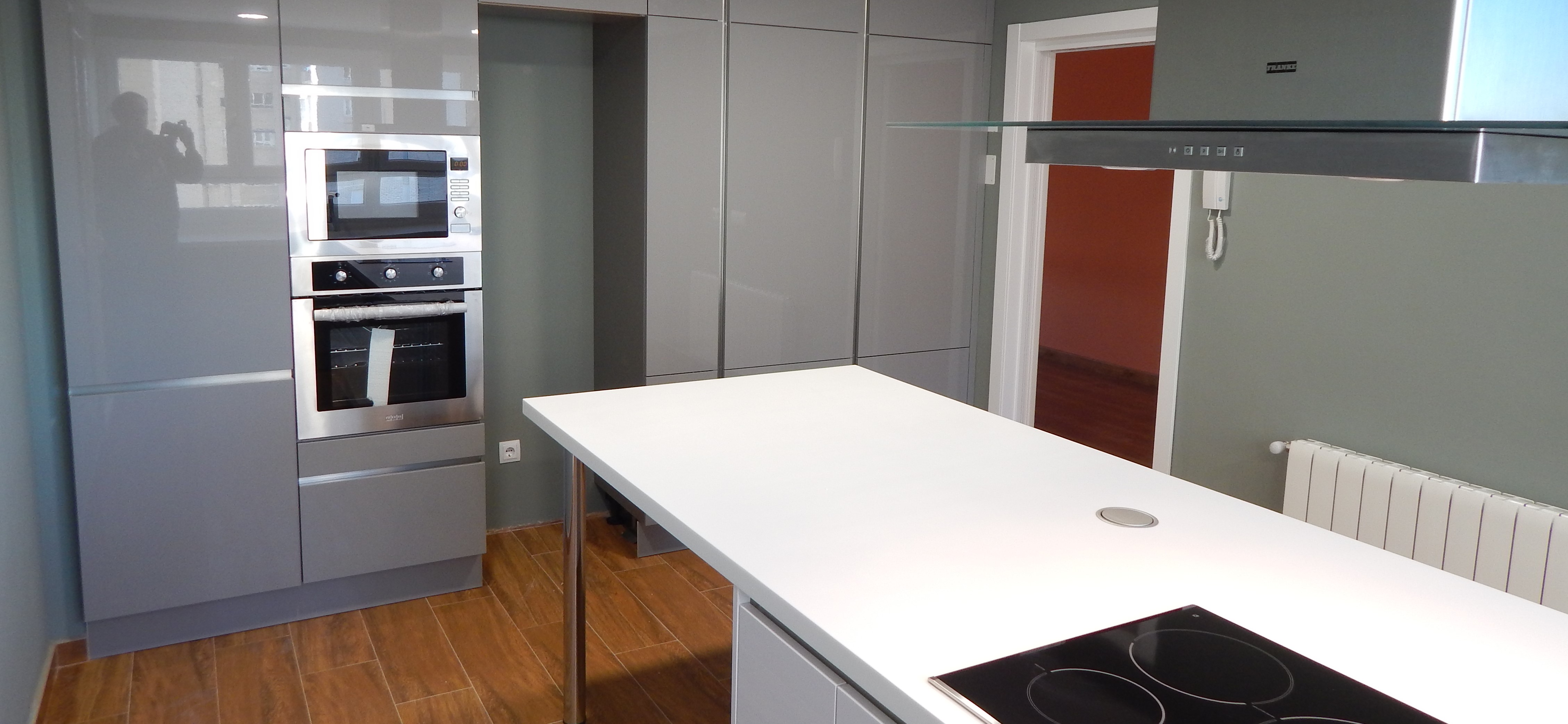 Para la encimera se optó por el material acrílico (solid surface) en color pure white.  Este material tiene unas propiedades perfectas para la cocina: Su composición lo hace totalmente higiénico por su nula porosidad, permite realizar cualquier forma sin juntas apreciables incluso con formas curvas (como la junta entre la encimera y copete) evitando la formación de rincones que dificulten la limpieza.