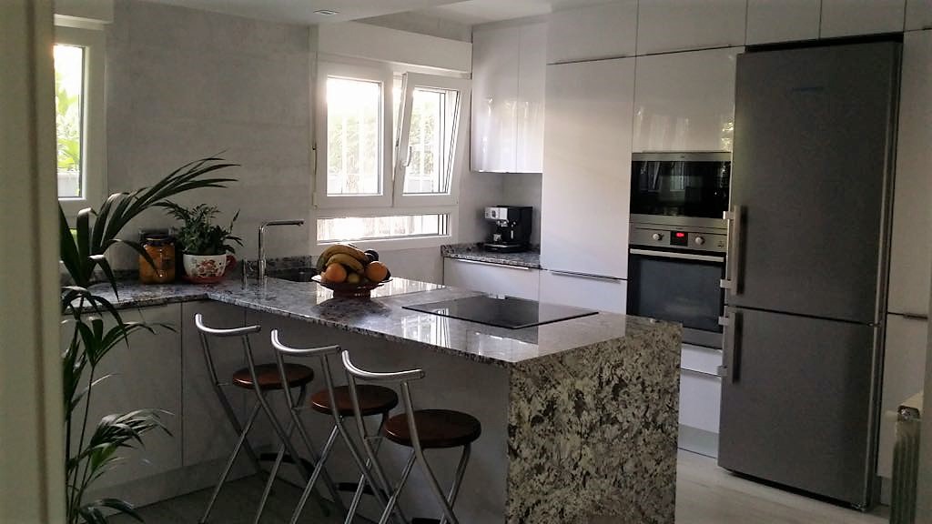Muebles de cocina laser blanco polar brillo es el modelo elegido para esta nueva instalación de concepto abierto.  El diseño lineal fue una prioridad para mantener una estética muy estudiada en la que todo encaja.