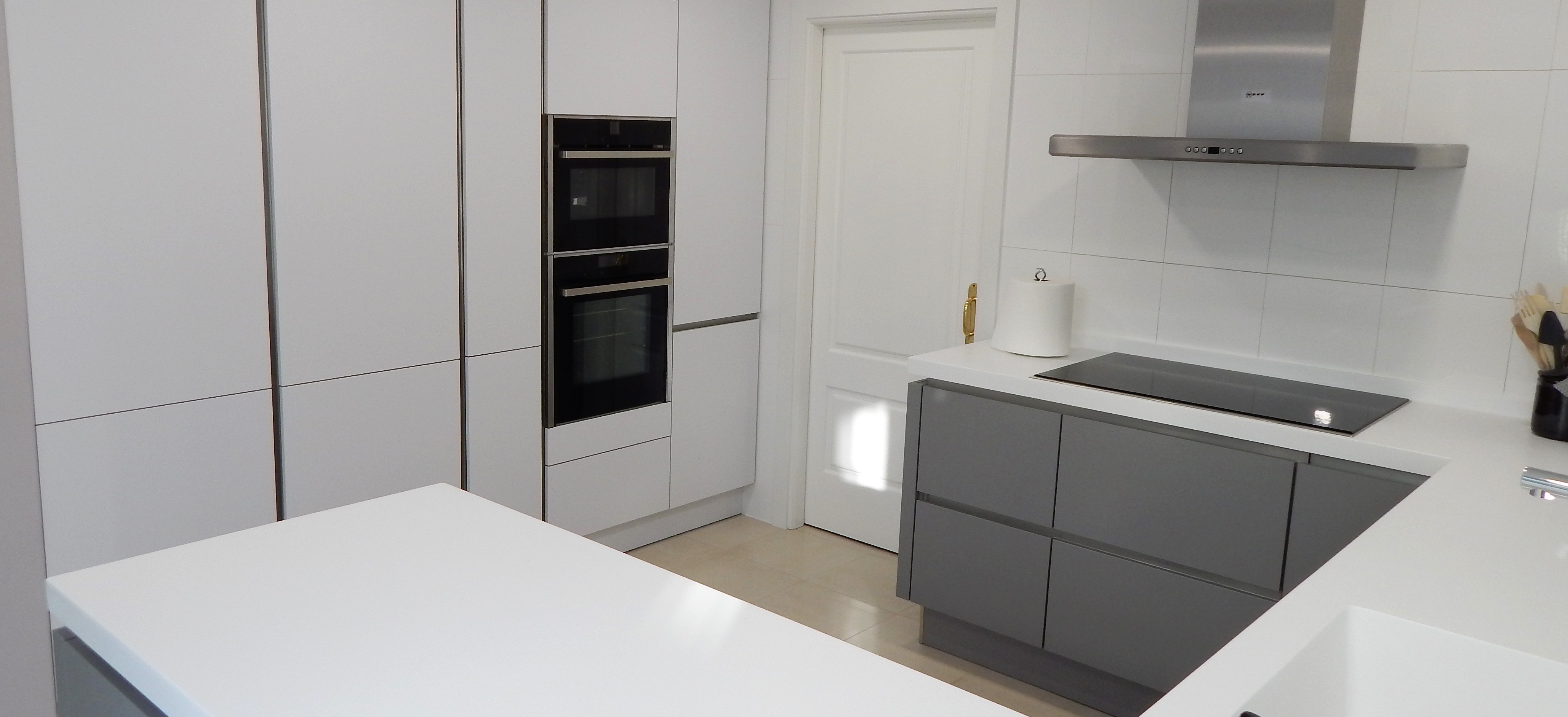 Gris perla y blanco se combinan en esta nueva instalación. Nuestros muebles de cocina laser, el diseño sin tirador, la encimera acrílica sin juntas y los módulos con frentes de gran tamaño son el punto de partida de este diseño.