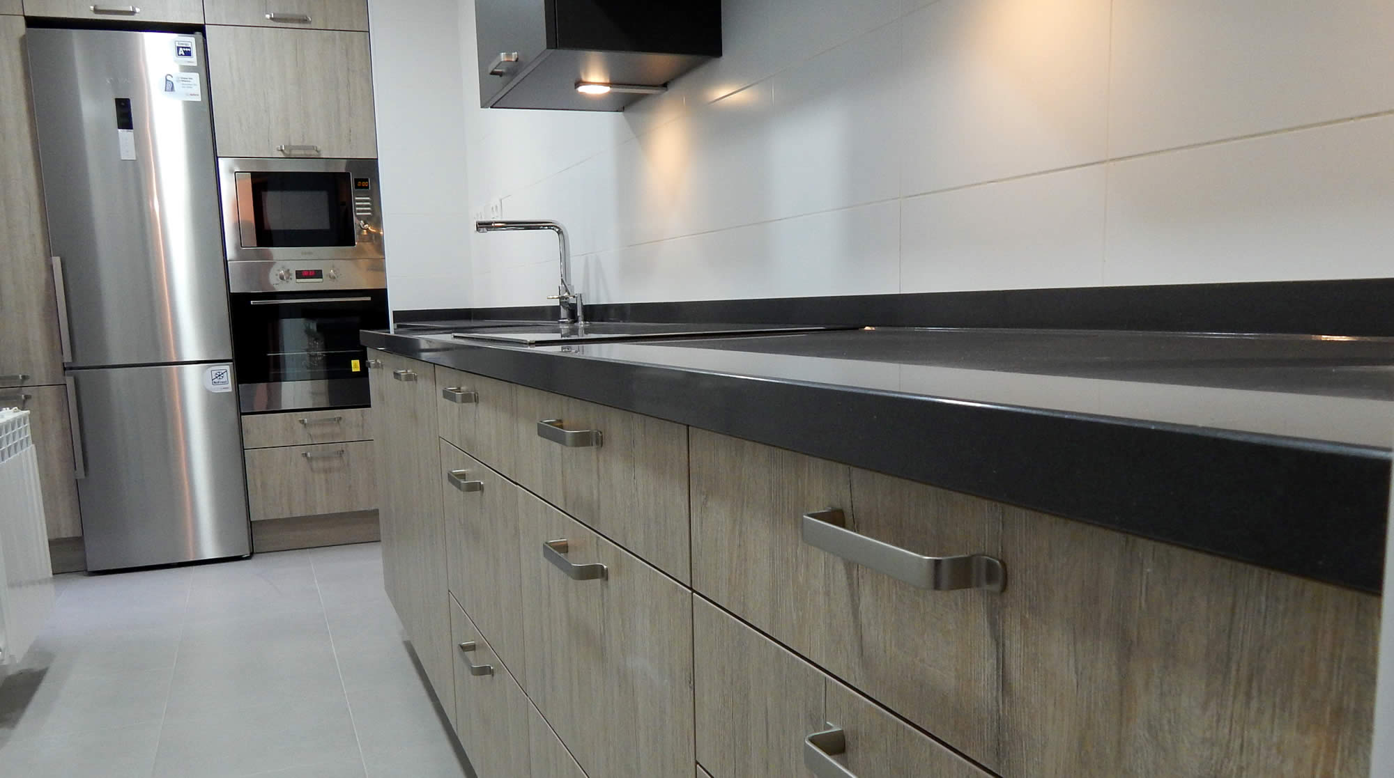 Raúl eligió este modelo en color roble gris seda combinándolo con el color antracita para muebles altos, armazones y encimera. La distribución incorpora gavetas y cajones de gran capacidad para hacer más cómodo el uso diario, una gran despensa extraíble garantiza el orden en la zona de almacenamiento.