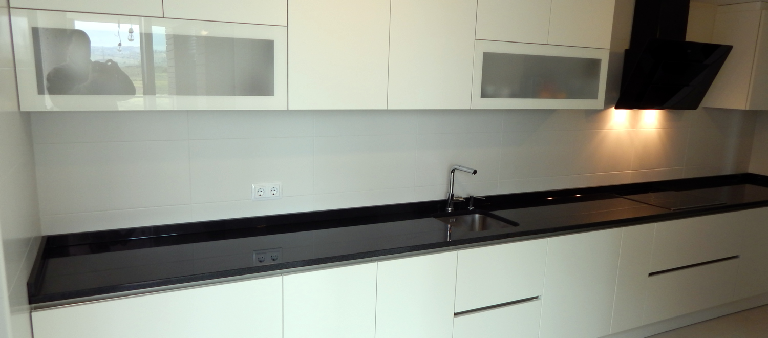 En esta instalación de configuración alargada se optó por el empleo del diseño sin tirador. El diseño lineal de color claro destaca con el marcado carácter del granito negro intenso y la campana vertical de cristal negro. Las vitrinas sin marco de formato alargado, proporcionan capacidad de almacenamiento sin sobrecargar el espacio.