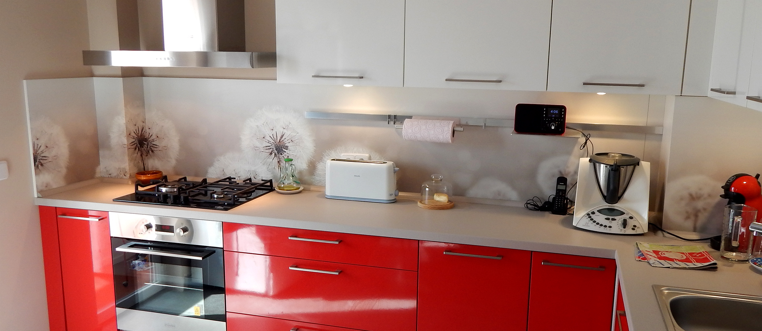Qué alegre la cocina y que original el panel con diente de león. Enhorabuena!!!