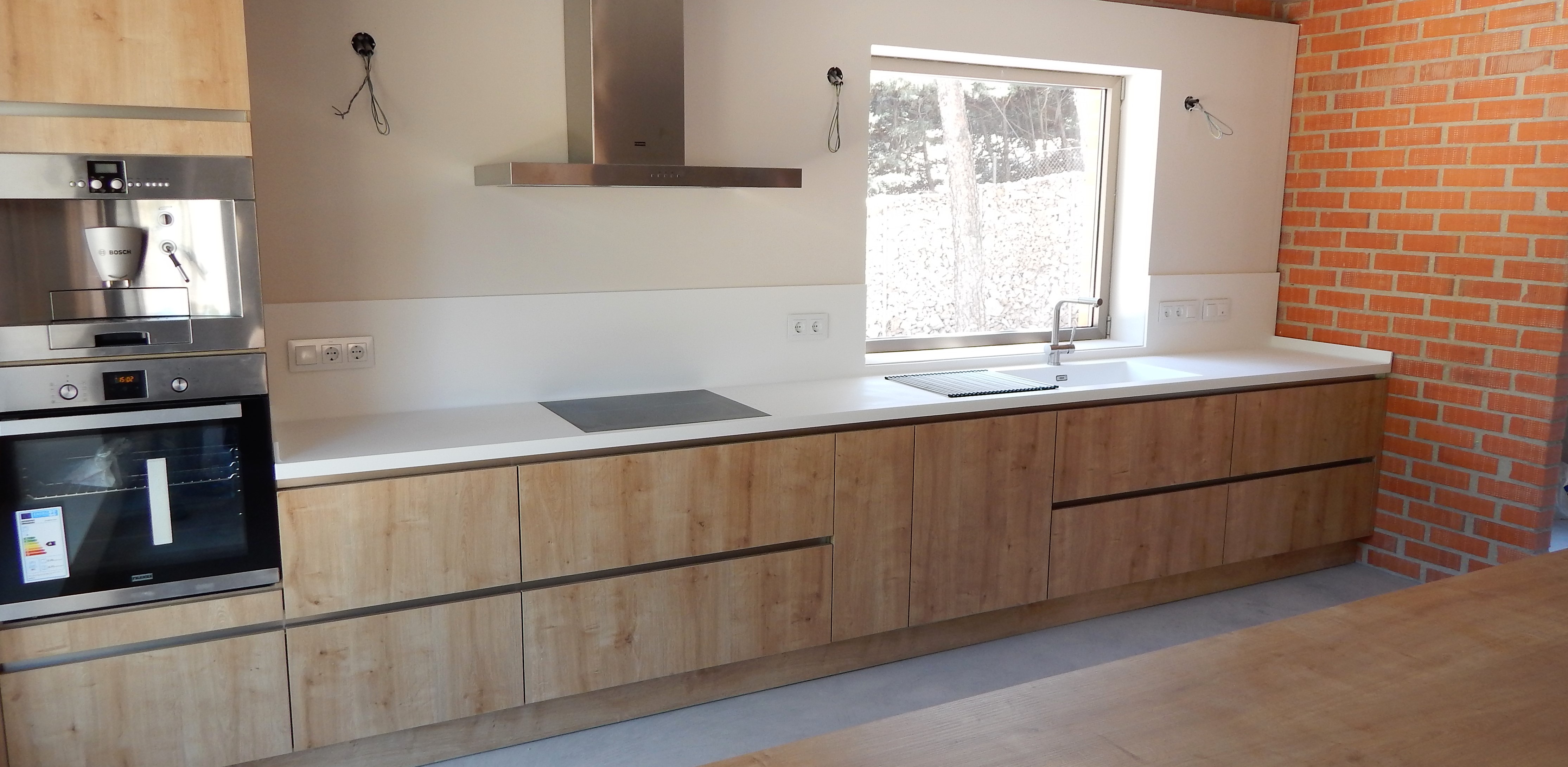 Rocio y Ricardo han elegido nuestro modelo bali en color roble cornwall para su nueva casa.  Para la encimera han optado por el acrílico (solid surface) en color pure white.  Este material tiene unas propiedades perfectas para la cocina: Su composición lo hace totalmente higiénico por su nula porosidad, permite realizar cualquier forma sin juntas apreciables incluso con formas curvas (como la junta entre la encimera y el frente de pared que crea una superficie que aparenta ser un bloque de una pieza) evitando la formación de rincones que dificulten la limpieza.  Podéis ver más información de este material en este enlace: encimeras acrílicas