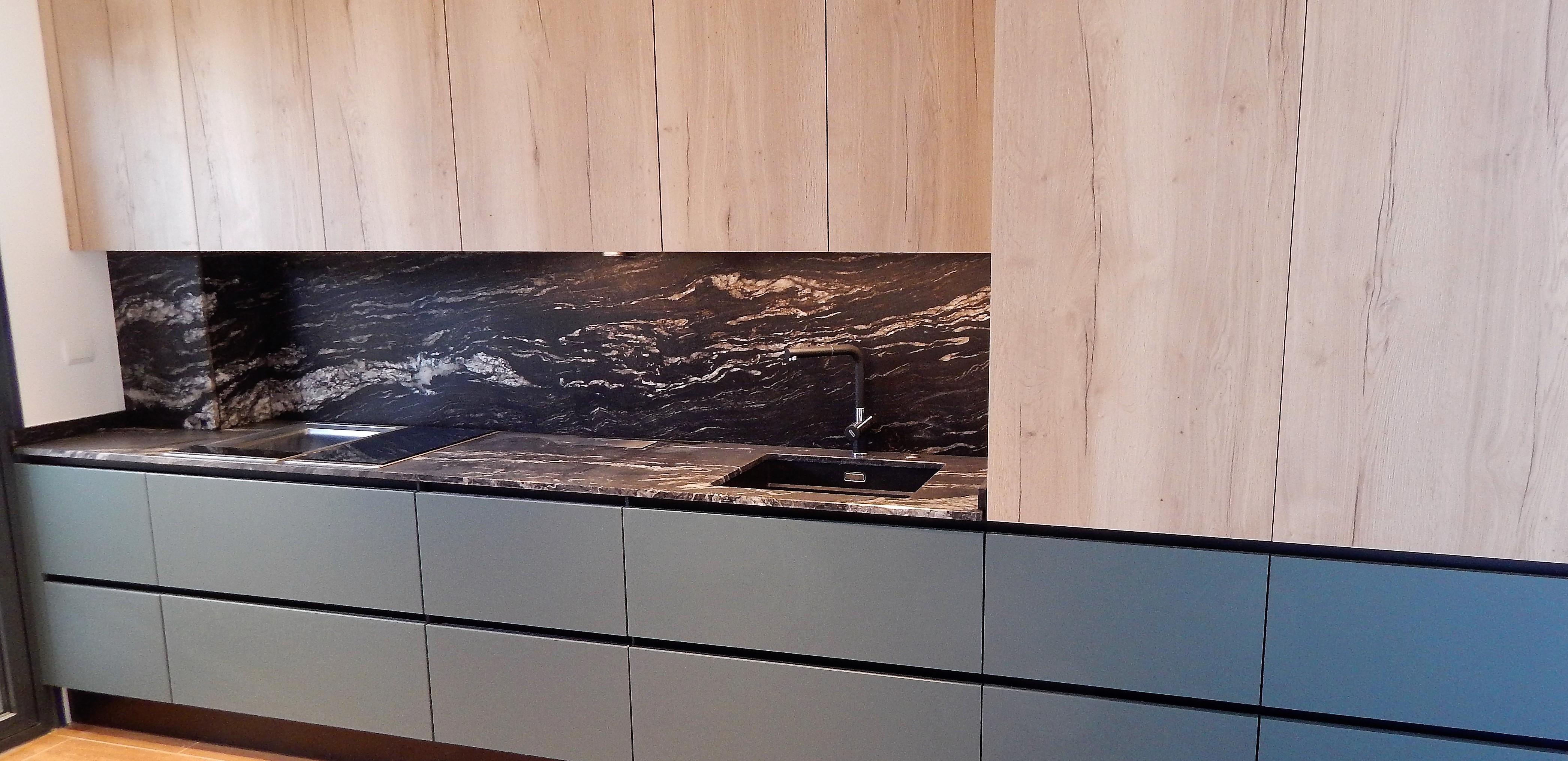 Arantxa y Carlos han elegido esta combinación para su nueva cocina.  Para la encimera se optó por una encimera de granito de Naturamia, una espectacular pieza que cubre también el frente de pared.