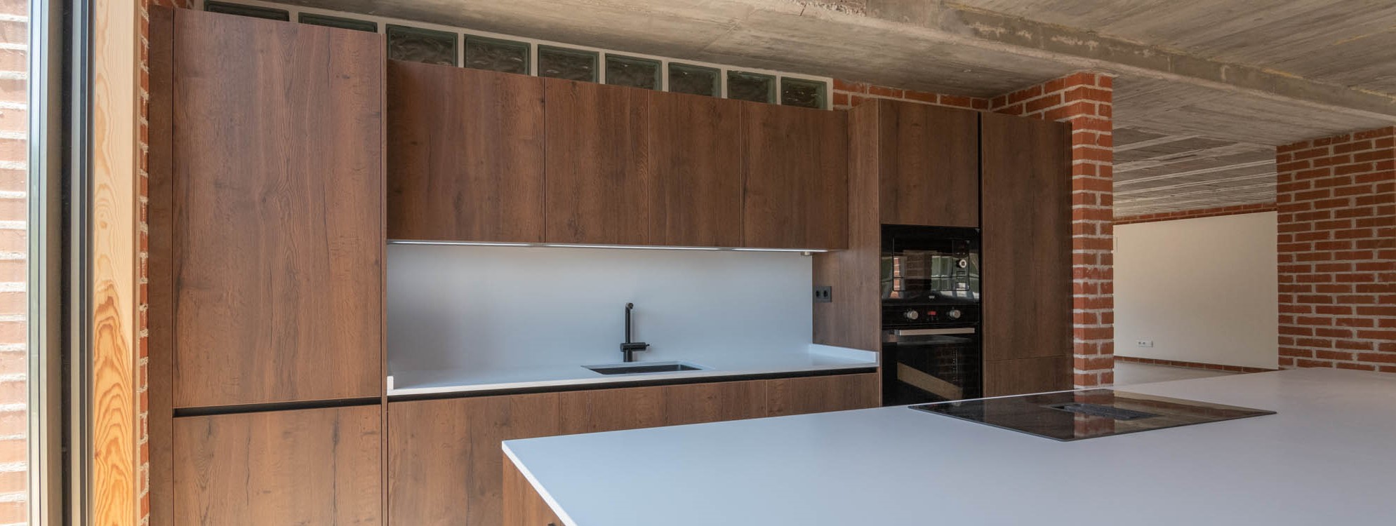 La isla central incorpora la zona de cocción, el reto consistía en tener una extracción adecuada, difícil de conseguir en una estancia con el techo tan alto. Para conseguirlo se optó por una inducción con la campana incorporada en el mismo equipo.