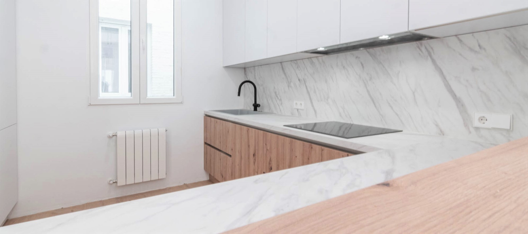 La calidez de la madera y la superficie tipo mármol, conforman un acogedor conjunto que se complementa con el blanco polar en mate. Esta combinación de materiales crea un cálido ambiente que invita a disfrutar del placer de cocinar.
