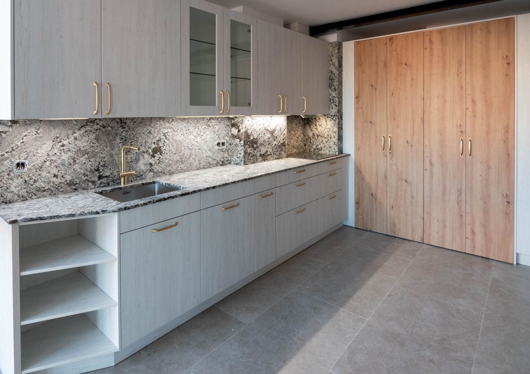 Madera de roble estilo nórdico y una encimera de piedra natural con gran carácter son las cables de este nuevo montaje. Un conjunto con mucha personalidad en el que se aprovecha el espacio creando varias zonas de trabajo bien delimitadas.