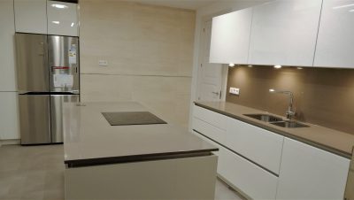 Muebles de cocina en laca alto brillo en blanco. Nuestro modelo 4030 destaca por su acabado en brillo intenso y agradable tacto. Está disponible en una amplia variada de colores y admite el diseño con tirador convencional o con gola de acero, como en este montaje. Este modelo pertenece a nuestra colección «exclusivo» y cuenta con