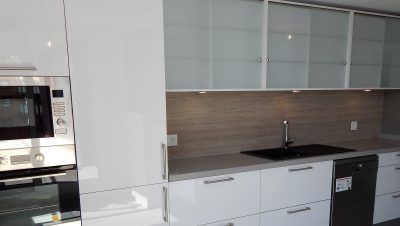Muebles de cocina en blanco modelo laser. Diseño sin tirador, blanco polar alto brillo, encimera acrílica en blanco y frente de cristal en gris metalizado.