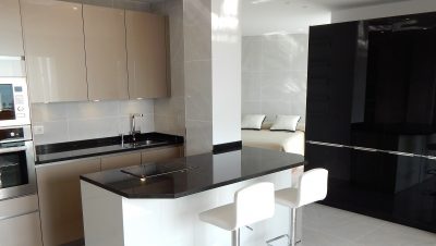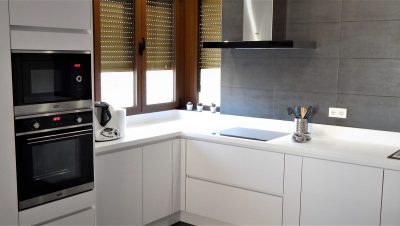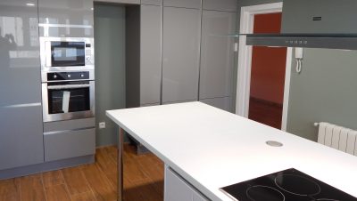 Muebles de cocina laser sin tirador Gris perla y blanco se combinan en esta nueva instalación. Nuestros muebles de cocina laser, el diseño sin tirador, la encimera acrílica sin juntas y los módulos con frentes de gran tamaño son el punto de partida de este diseño. Mª Carmen y Jose han elegido este modelo en su