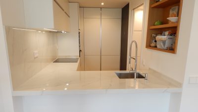 Cocina abierta en blanco. Nuestros muebles de cocina modelo laser son los protagonistas de este diseño abierto al salón, el diseño lineal, sin tiradores crean un conjunto perfectamente integrado.