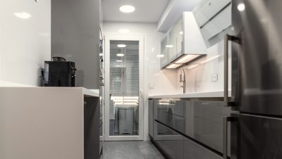 Muebles de cocina sin tirador Gris perla y blanco se combinan en esta nueva instalación. El diseño sin tirador y los módulos con frentes de gran tamaño son el punto de partida de este diseño. Mamen y Antonio han elegido este modelo por su brillo intenso y su fácil mantenimiento. En el diseño destaca