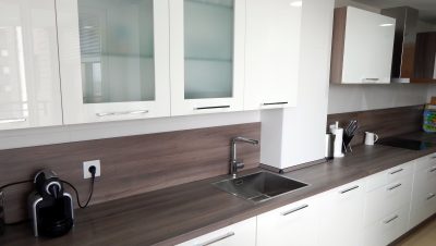 Muebles de cocina en blanco polar El diseño sin tirador, el aprovechamiento de cada espacio y la optimización de la distribución juegan un carácter vital en este montaje. Nuestro modelo Lasser en blanco polar en acabado alto brillo, combinado con encimera color gris plomo fue el elegido en esta ocasión. Es un modelo con un acabado