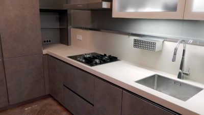 Muebles de cocina sin tiradores, imitación piedra. Nuestro modelo 4080 es un moderno diseño imitación piedra en color salento gris, es un material muy resistentes en el que destaca los cantos en acero inoxidable. Este novedoso modelo está teniendo mucho éxito entre nuestros Clientes, por este motivo, en las nuevas colecciones para el año 2014,