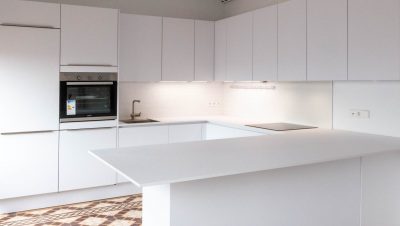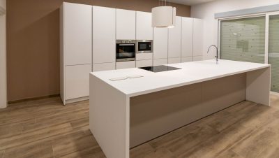 Cocina abierta en blanco. Nuestros muebles de cocina modelo laser son los protagonistas de este diseño abierto al salón, el diseño lineal, sin tiradores crean un conjunto perfectamente integrado.