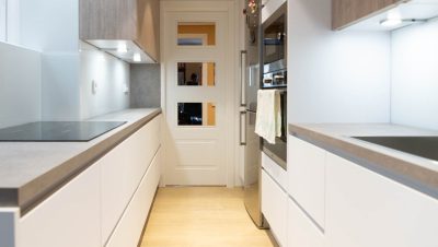 Cocina en blanco. Nuestros muebles de cocina modelo top brillante son los protagonistas de este diseño, el diseño lineal, sin tiradores crean un conjunto con luz propia.