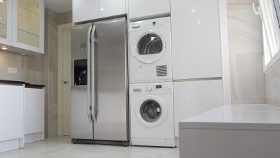 Muebles de cocina en blanco modelo laser. Diseño sin tirador, blanco polar y una distribución con frentes de gran tamaño forman una combinación brillante