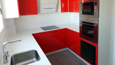 Muebles de cocina en rojo Aquí late el corazón de la casa. El punto de encuentro de los cocineros y comensales entusiasma con su frente brillante y de fácil limpieza, con una técnica de cocina ergonómica y práctica. Eukeni y Vicky se han decidido por nuestro modelo NEO, es un estratificado muy resistente al uso diario,