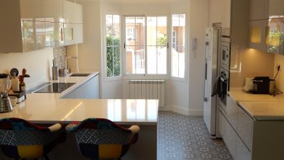 Muebles de cocina laser satén brillo Blanco y satén son los tonos elegidos en esta amplia cocina abierta al salón. Una combinación que crea un acogedor espacio que invita a disfrutar del equipamiento: diseño sin tirador, campana integrada en la encimera, mueble rincón de cestas giratorias y la estudiada iluminación led empotrada, son algunas de las