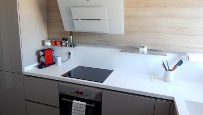 Mueble de cocina, frentes lacados alto brillo Os presentamos, en este nuevo montaje, nuestro modelo 4030. Es un lacado en alto brillo, con cantos ligeramente redondeados. Disponible en una amplia gama de colores, entre los que destaca el gris basalto de estos muebles de cocina. Para la encimera, Coni y Rubén han elegido nuestra encimera
