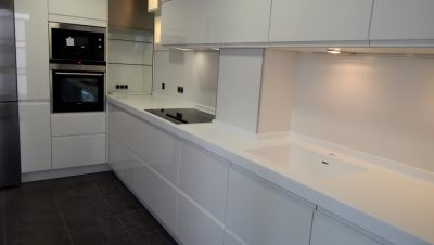 Diseño en blanco con uñero Muebles de cocina modelo 5025. Este modelo se caracteriza por el perfil de la puerta, el rebaje en el canto proporciona una cómoda superficie para la apertura y evita usar tiradores tradicionales. El material es lacado alto brillo sobre una superficie MDF, el proceso de lacado, incluyendo la capa brillante en poliuretano, confiere una gran resistencia al uso