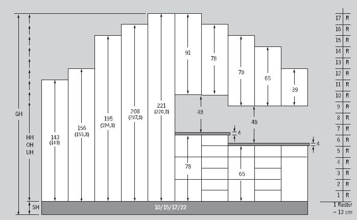 Extensa gama de medidas para adaptarnos a su espacio y conseguir una cocina totalmente ergonómica adecuada al usuario. 2 alturas de armario bajo, 4 alturas de armario alto, 5 alturas de armario columna, 3 alturas de zócalo estándar, 3 medidas de fondo estándar.