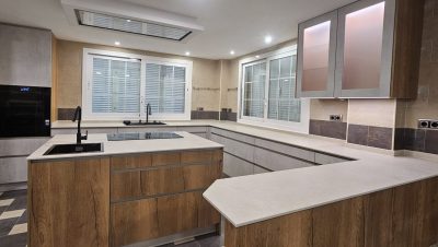 Muebles de cocina en el modelo Topo Soft cachemir combinado con el modelo Smart acabado arena. Encimera granito exclusivo