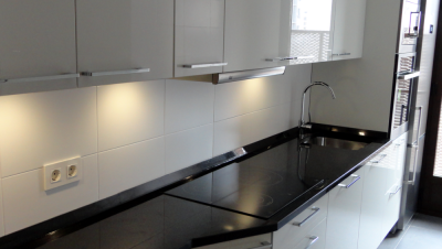 Cristina y Javier han elegido nuestro modelo Stratos, lacado de brillo intenso, combinado con granito negro. Una atractiva combinación en la que el gran contraste entre los frentes y la encimera crea un ambiente que convence de inmediato. La combinación elegida consta de: Modelo stratos en blanco con los armazones